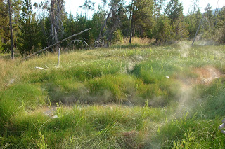 The trick to getting a parking spot at Artists' Paint Pots is to go early in the morning. Ahhhh...I love this place. I especially loved the white mud pot--cracked, bubbling, and white. I could have stared all day! After the paint pots I headed to Old Faithful to walk the 2.4 mile (round trip) path to Morning Glory pool. Along the way I got to see a nice eruption from Daisy Geyser. I took a different route on the way back and saw people gathering around Grand Geyser. There was a spot on the bench and about ten minutes later, it blew! All I can say is it was GRAND! The run-off from Grand has patches of orange that remind me of a creamsicle or dreamsicle or whatever they are. TR and I went to Bruce's evening program about wolves.